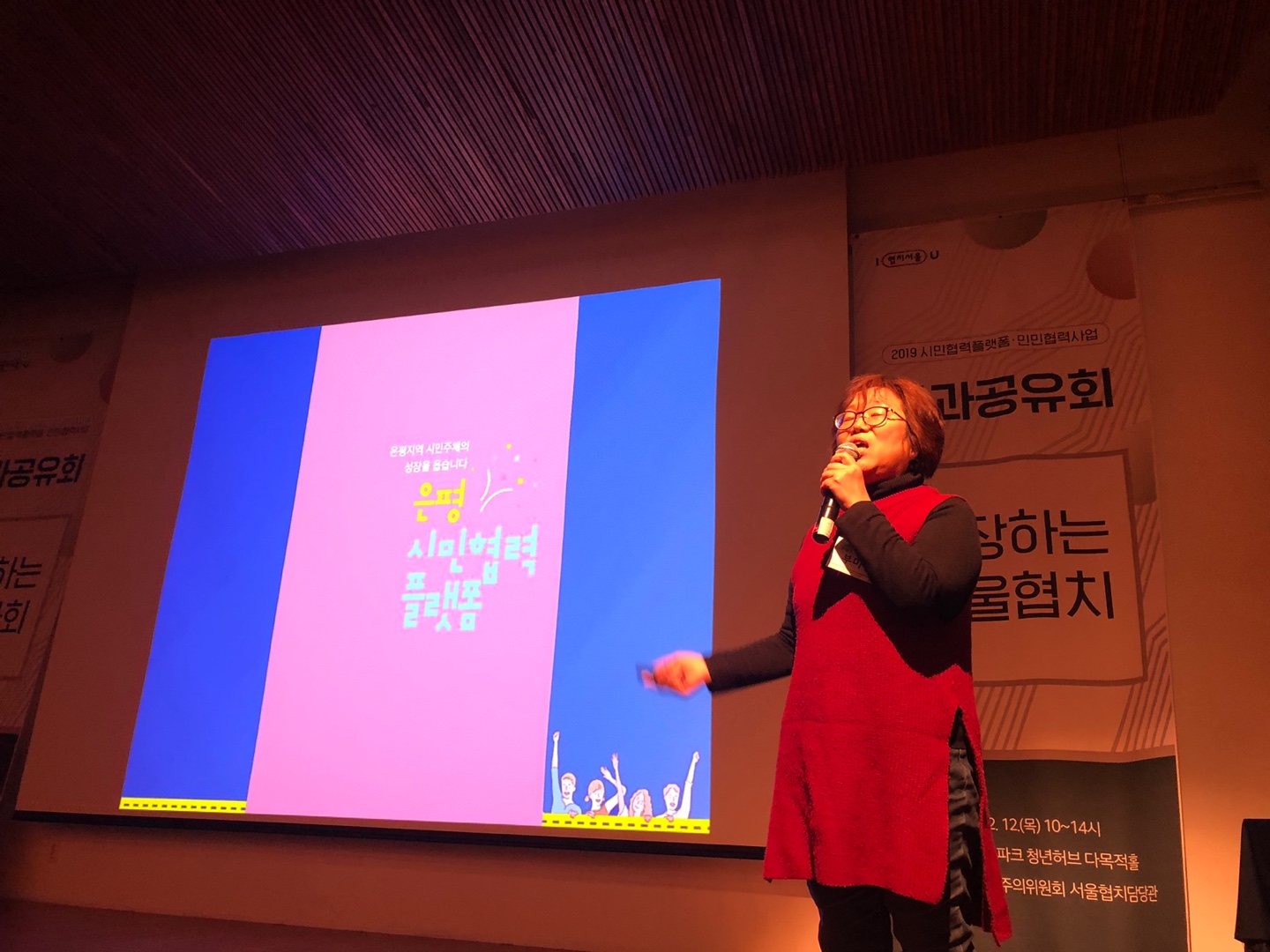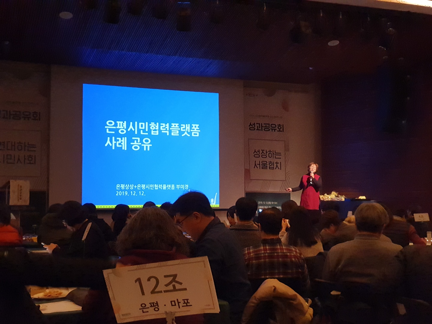 2019시민협력플랫폼·민민협력사업 성과공유회가 12월 12일(목) 서울혁신파크 미래청 다목적홀에서 열렸다. 은평상상+시민협력플랫폼은 3년차 사업지역으로 부미경 이사장이 "은평구 시민협력플랫폼 3년간의 도전"이라는 제목으로 사례발표를 했다. 😊 지역 시민사회 활성화와 시민성장을 위한 정책사업 을 통해 이룬 것과 앞으로도 지속해 나가야 할 것에 대해 말하고, 시민사회 활성화를 위한 공적 지원이 더 확장되고 지속되어야 한다는 점도 언급했다.